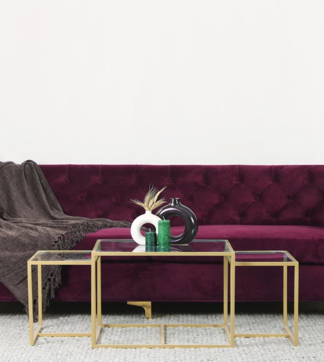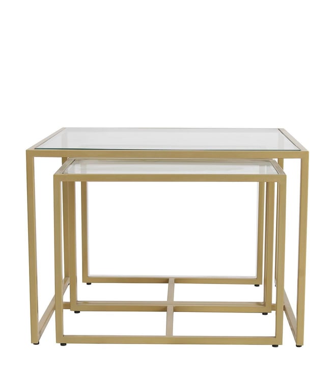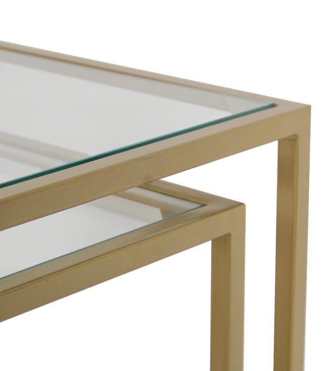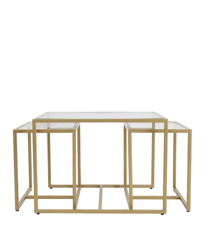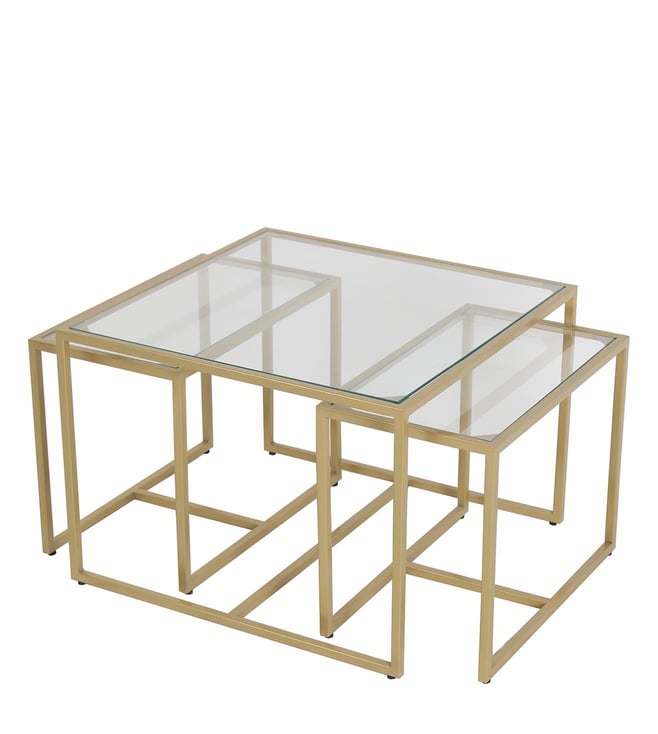 Elevate your living room with the Stendal Nesting Glass Coffee Table Set of 3. Each table features stunning glass paired with a gleaming gold finish.