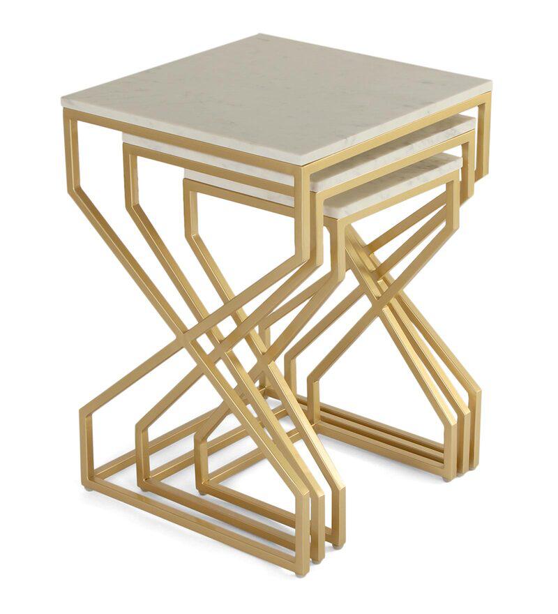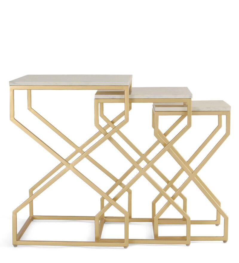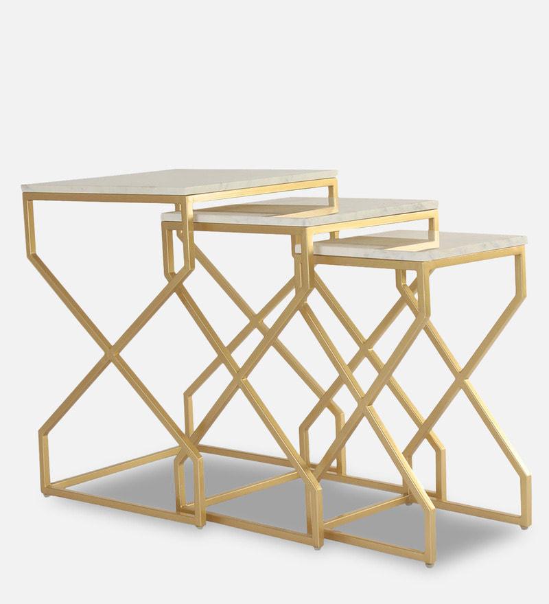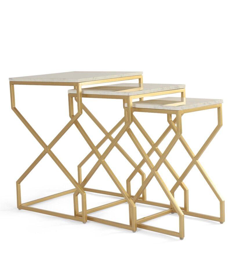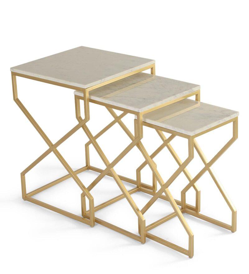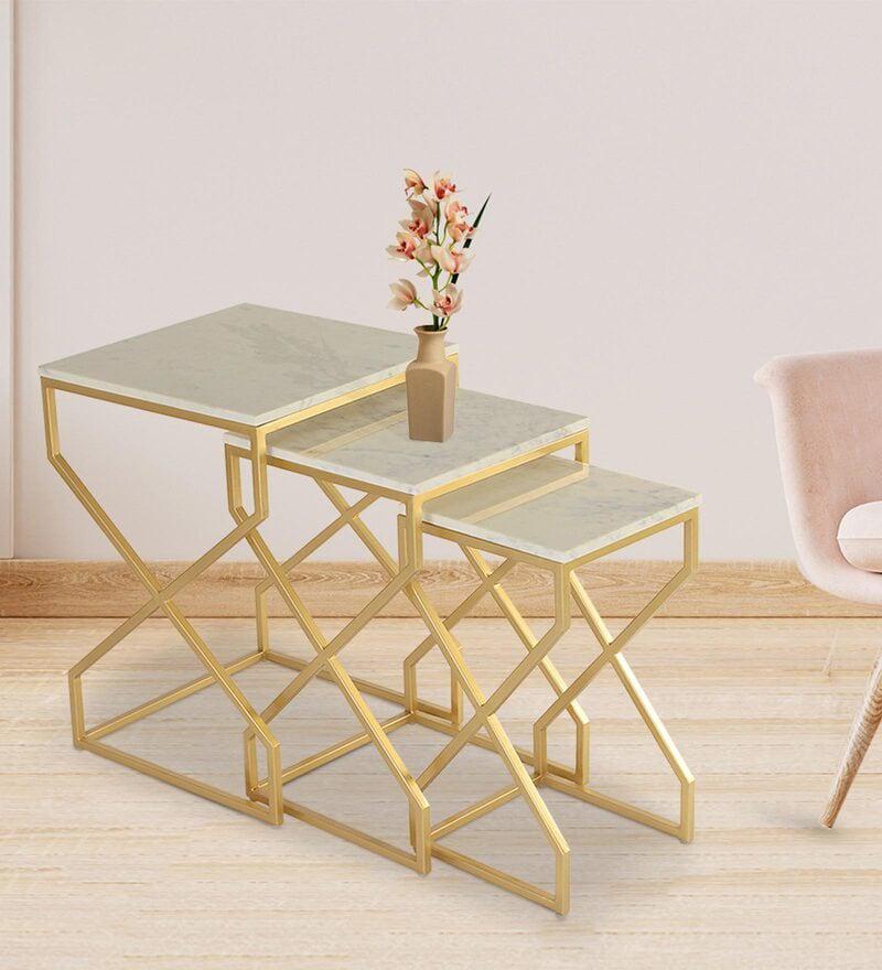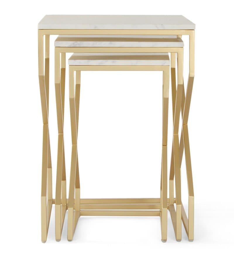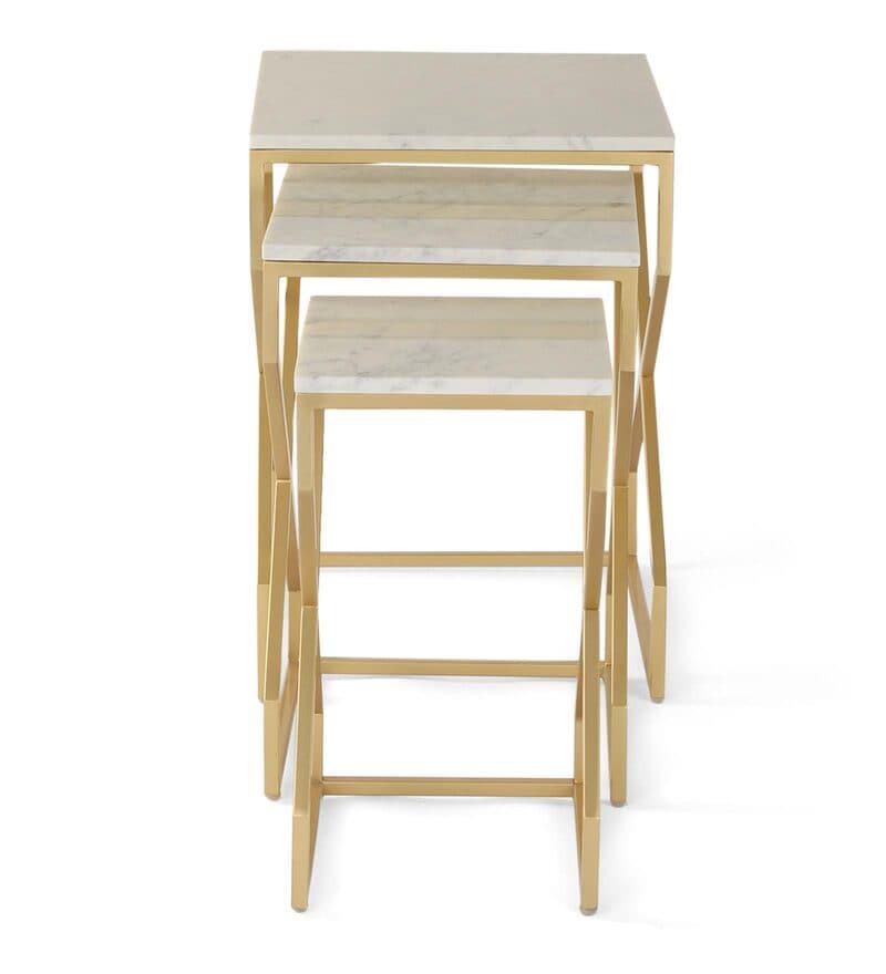 Elevate your living room with the Melbourne Nesting Marble Side Table Set of 3. Each table features stunning wonder white marble paired with a gleaming gold finish.