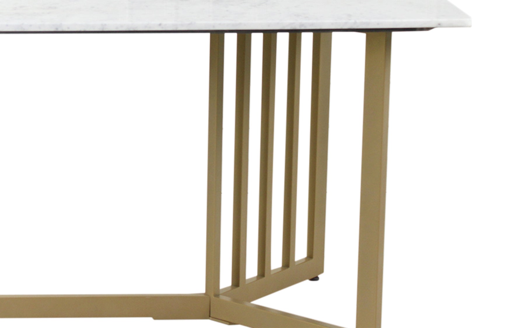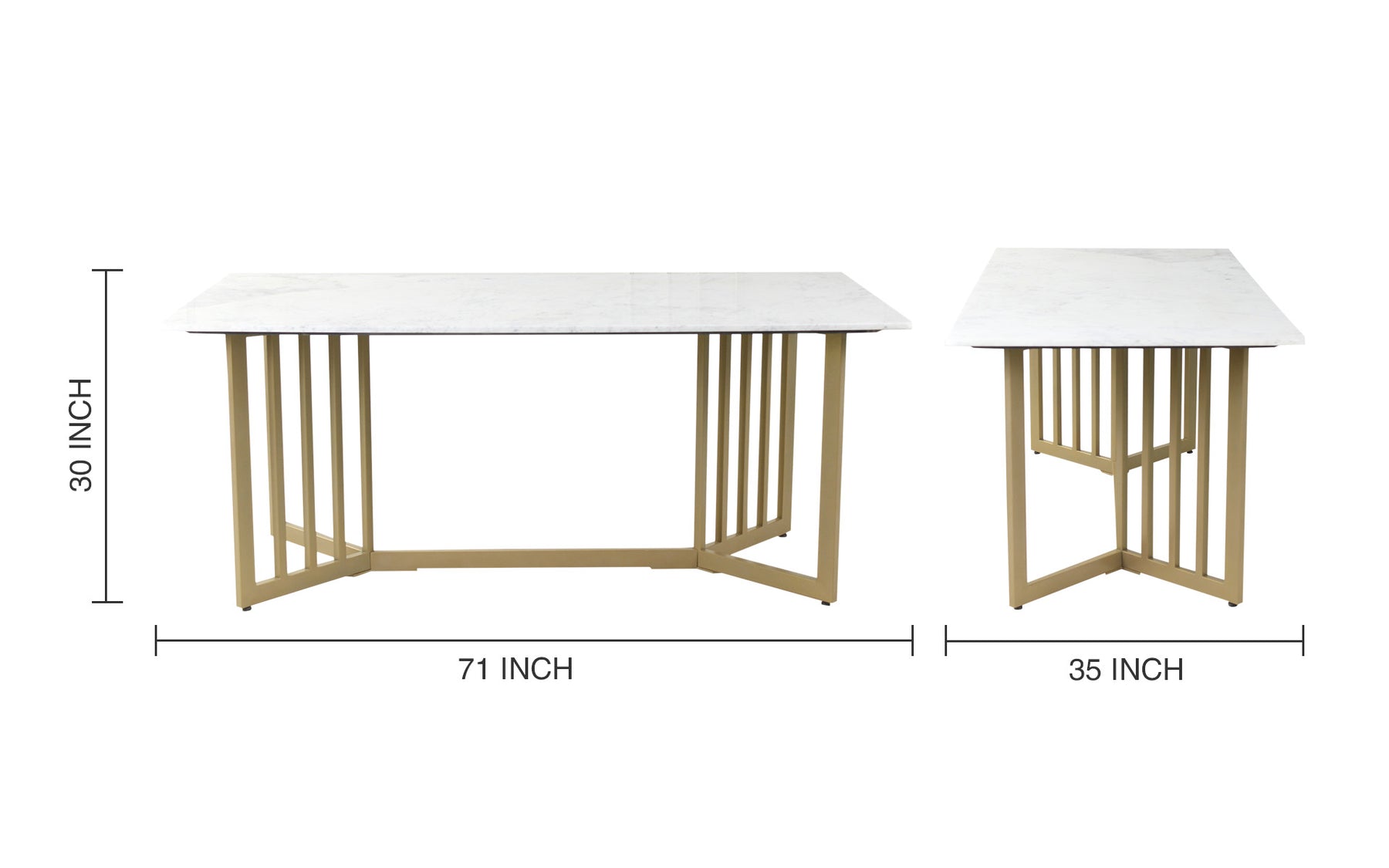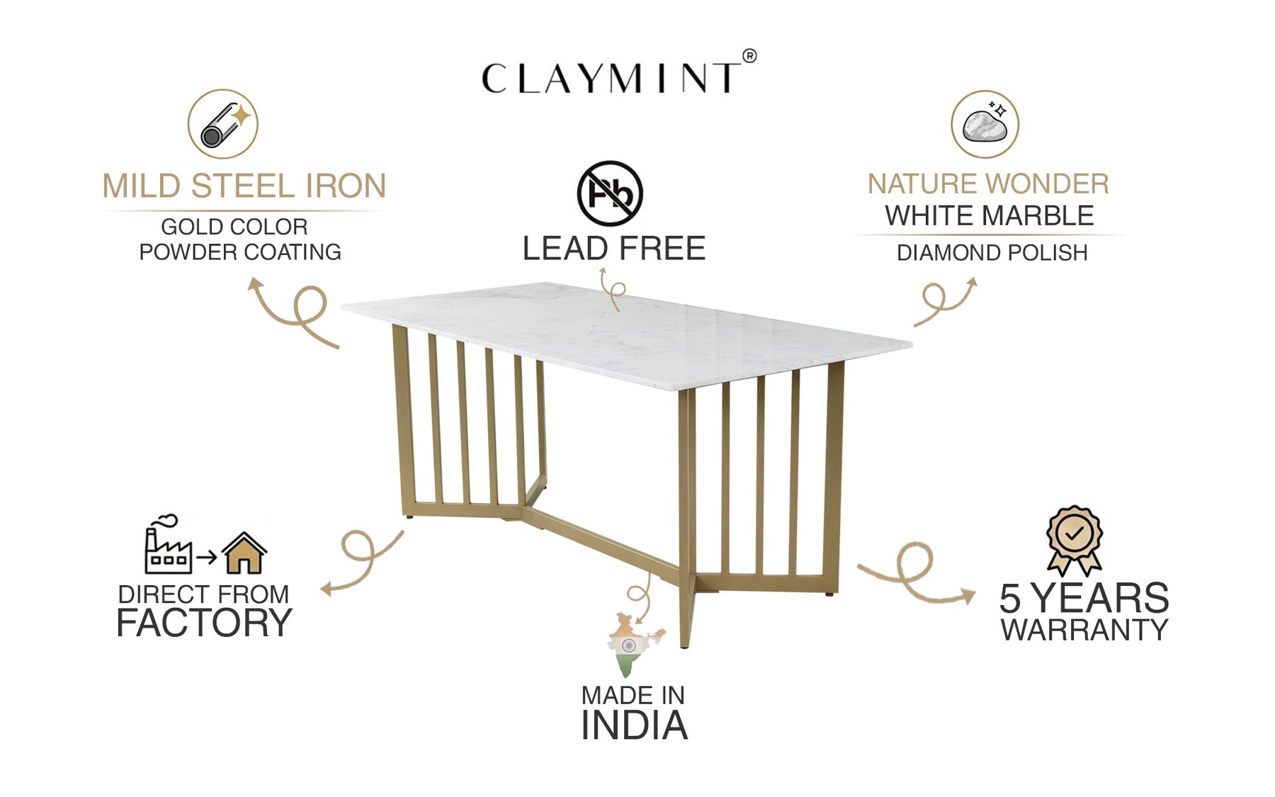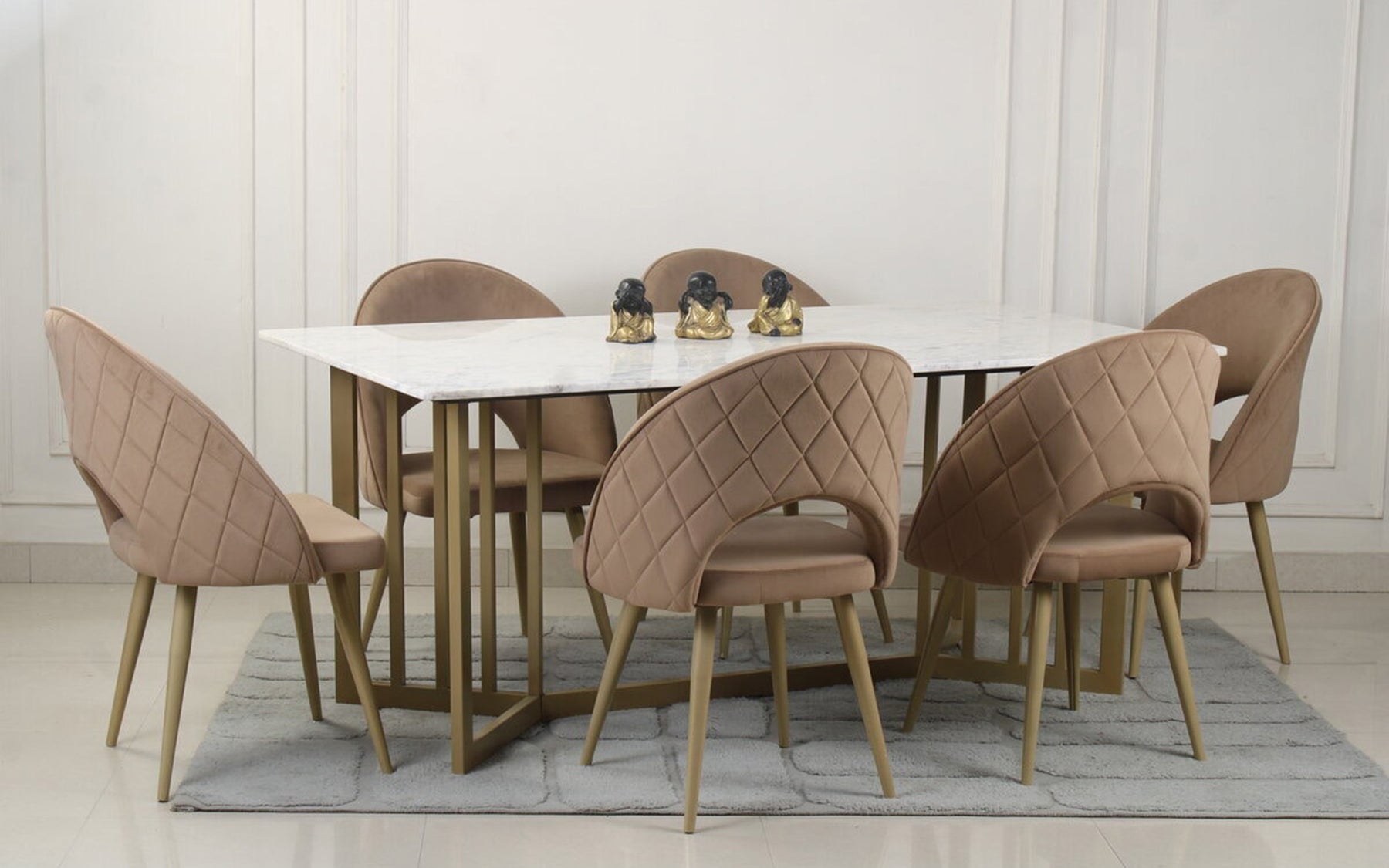 Allendale 6 Seater Dining Table Set in Gold Finish Elevate your dining space. The table features natural Wonder White marble with diamond polishing, supported by a sturdy CRC mild steel frame in gold finish—20% stronger than standard iron and powder-coated for rust resistance. Six matching chairs upholstered in luxurious brown velvet provide comfort and style.