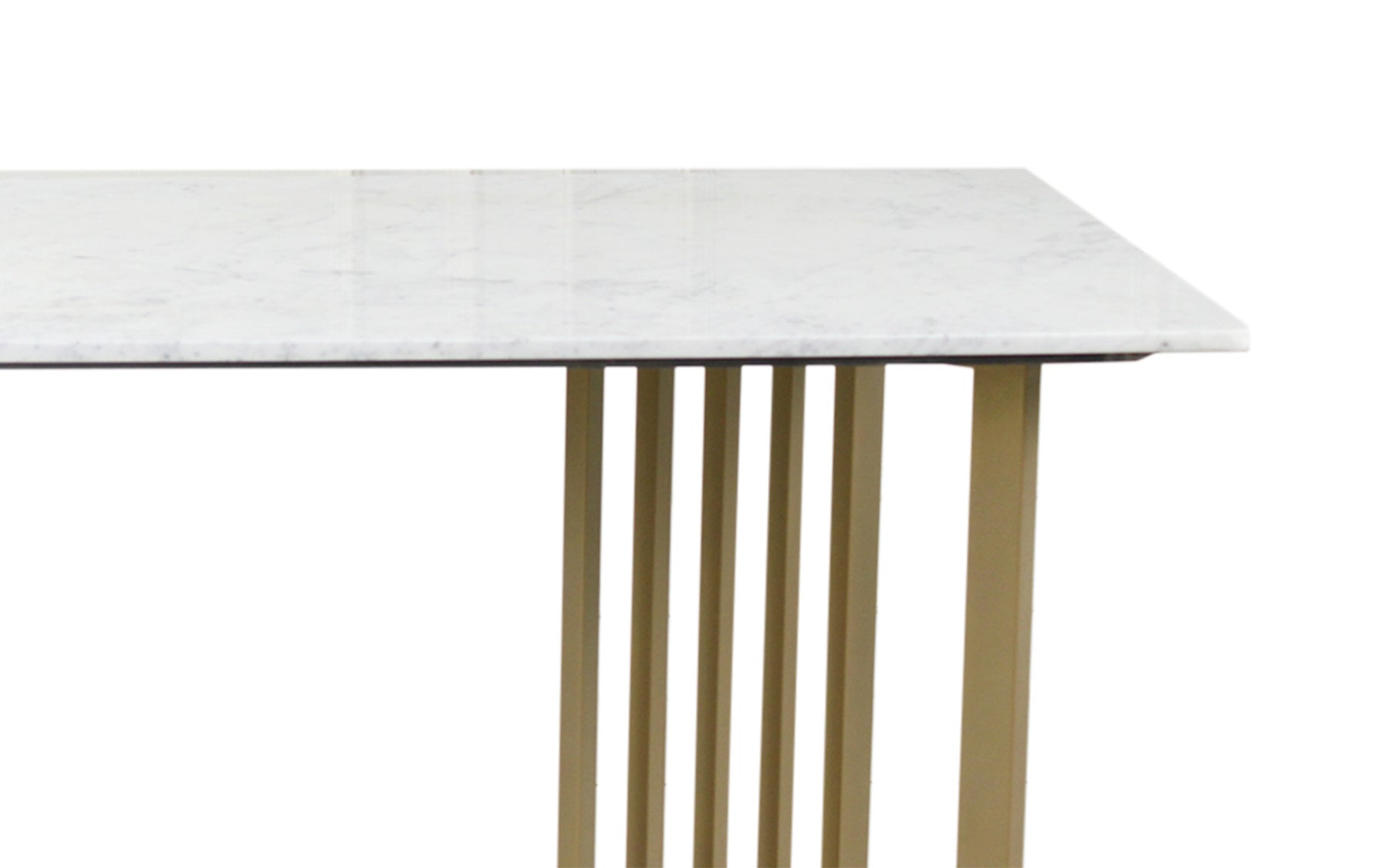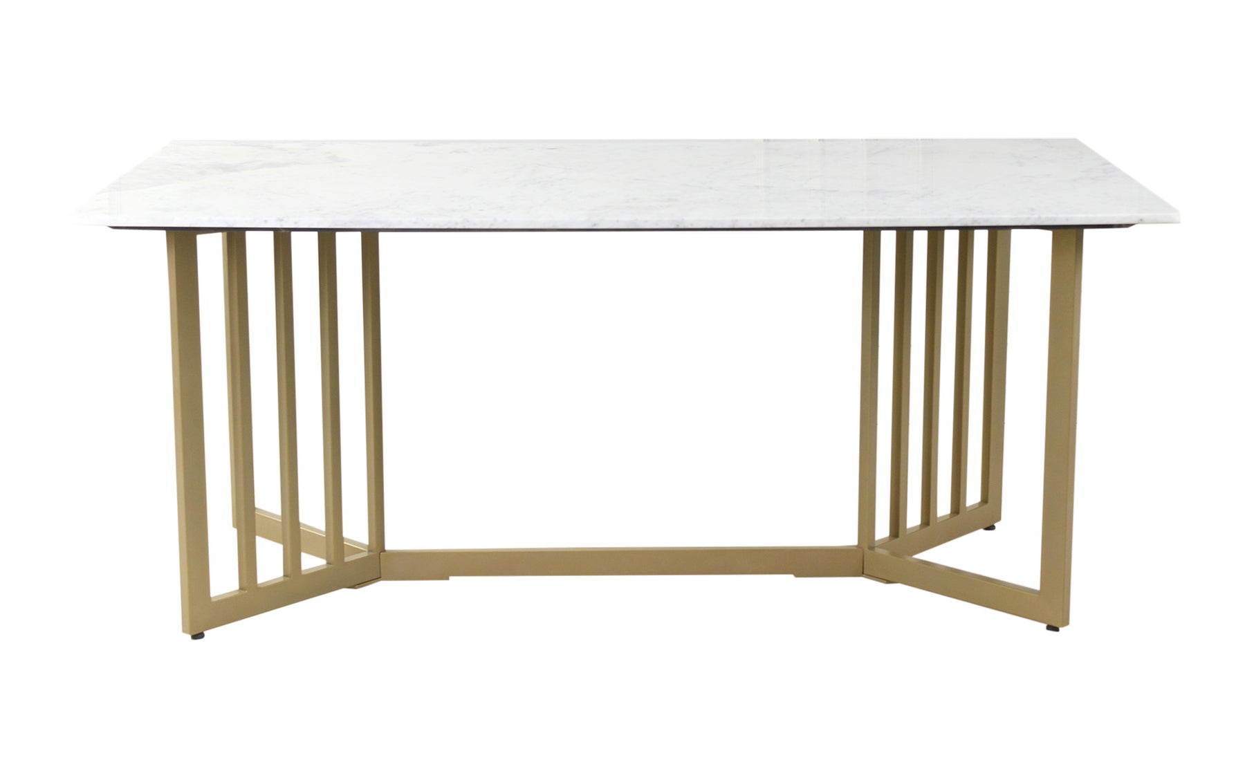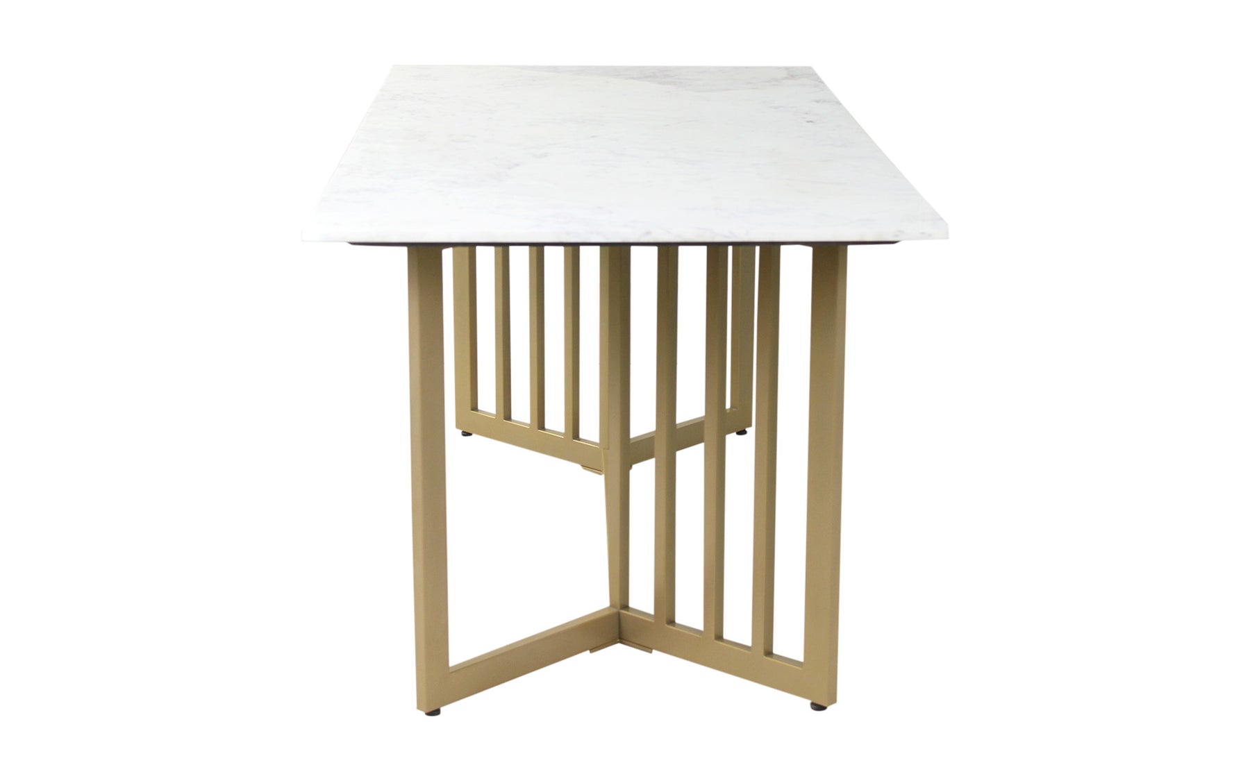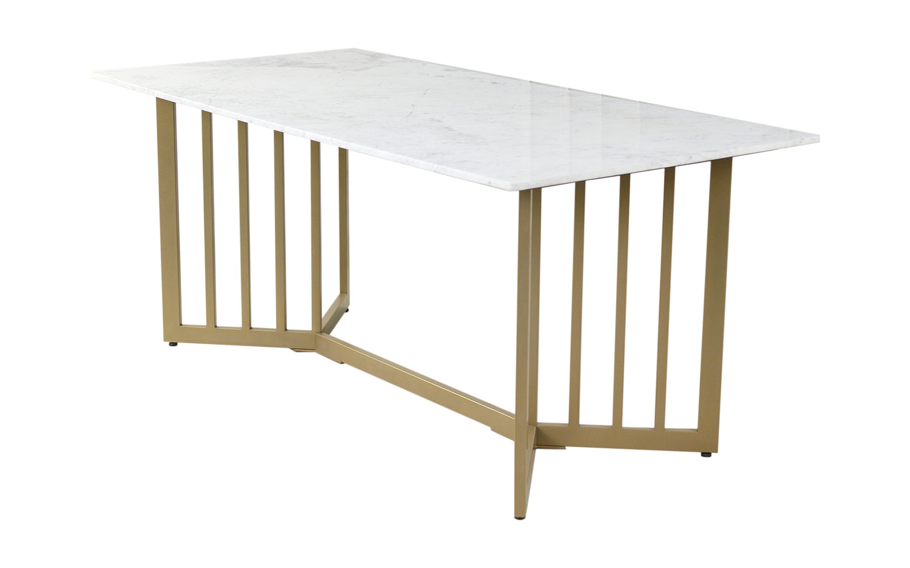 Allendale 6 Seater Dining Table Set in Gold Finish Elevate your dining space. The table features natural Wonder White marble with diamond polishing, supported by a sturdy CRC mild steel frame in gold finish—20% stronger than standard iron and powder-coated for rust resistance. Six matching chairs upholstered in luxurious brown velvet provide comfort and style.