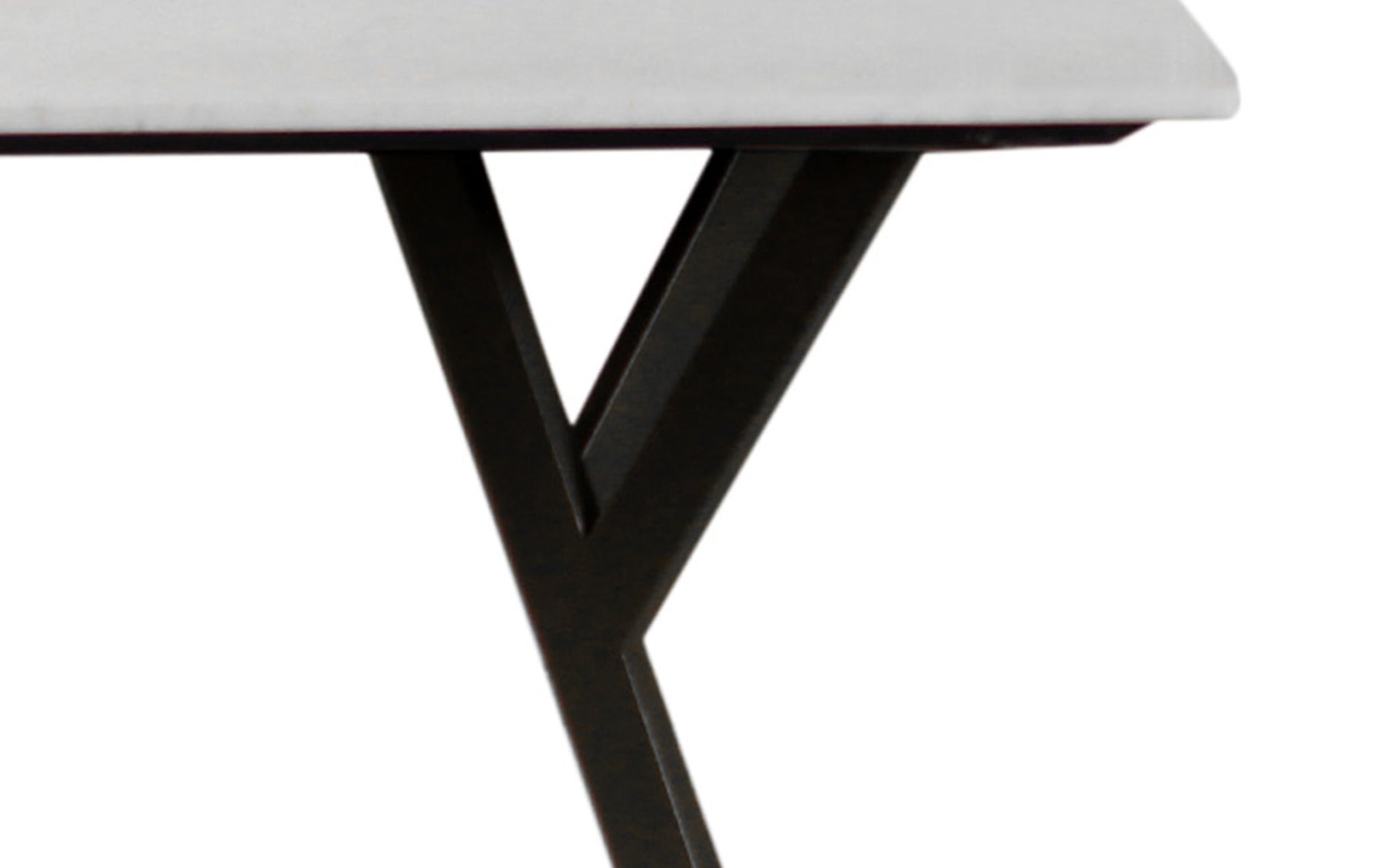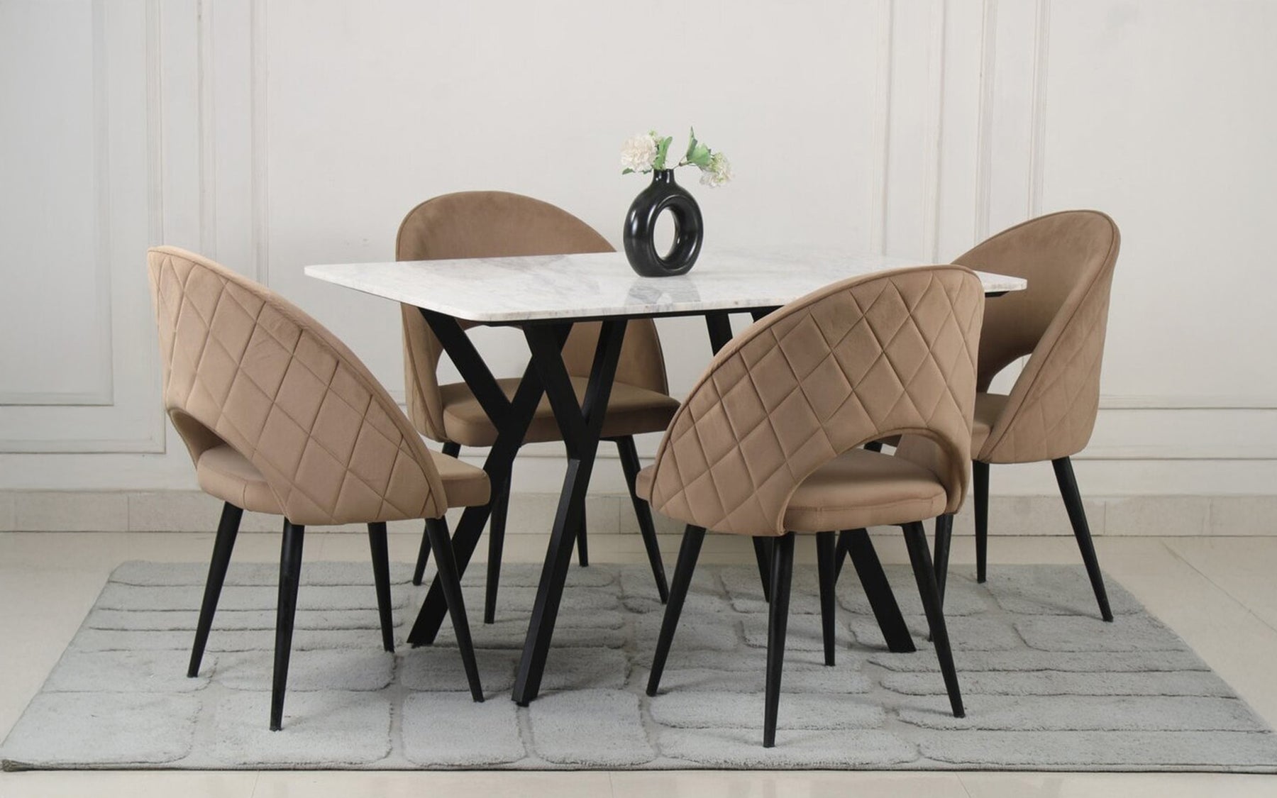 Elevate your dining space with the Armdale 4 Seater Dining Set, featuring a stunning Wonder White natural marble tabletop with diamond polishing. The table sits on a robust black-finished CRC mild steel base and powder-coated for lasting rust and corrosion resistance. Four comfortable brown velvet chairs complete the set, offering both style and durability.