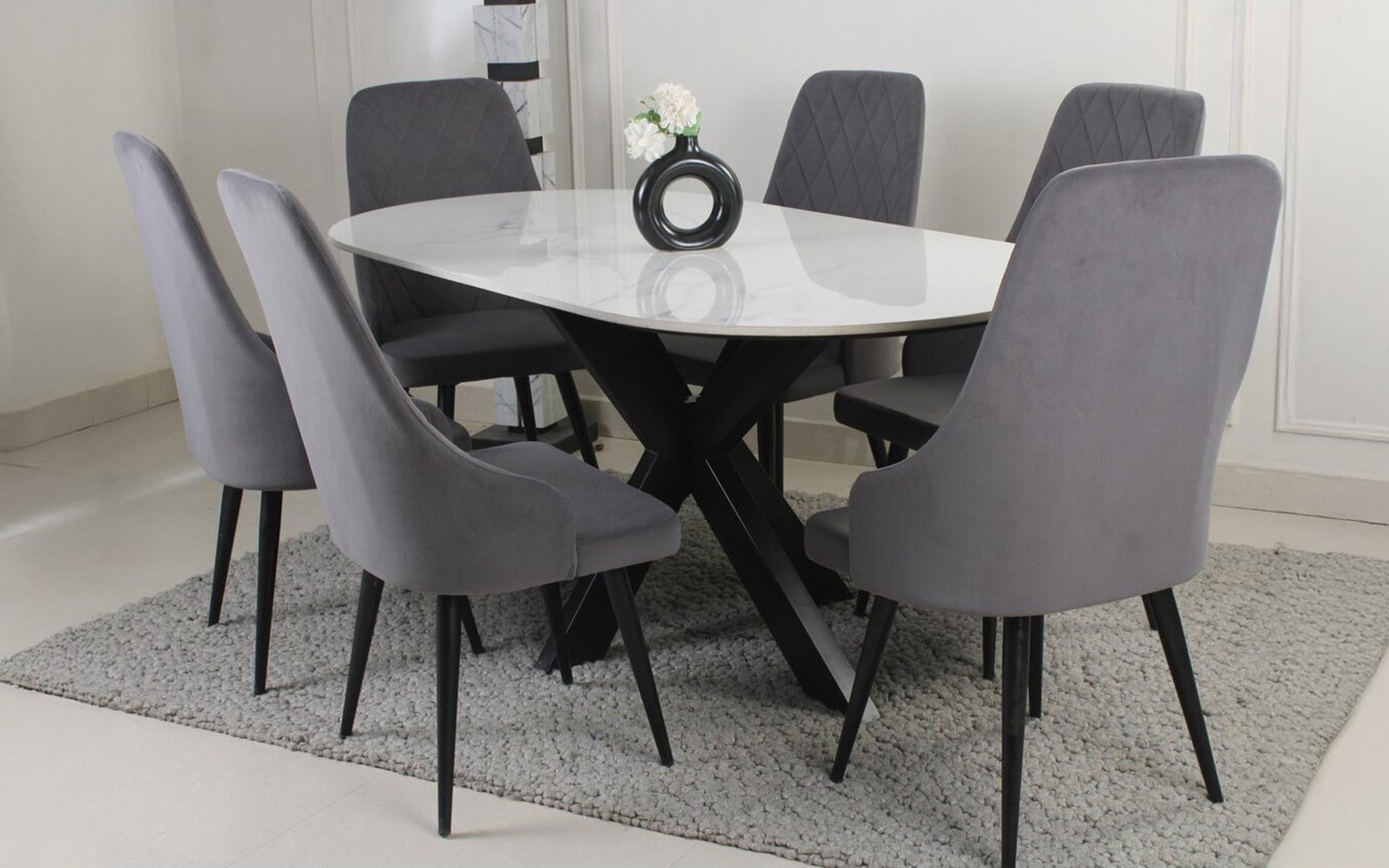 The Solano 6 Seater Composite Marble Dining Table Set combines elegance with durability. Featuring a glossy composite marble tabletop that resists stains and scratches, paired with a sturdy CRC mild steel frame. The black powder-coated finish ensures rust and corrosion resistance, while six grey velvet chairs provide comfortable seating.