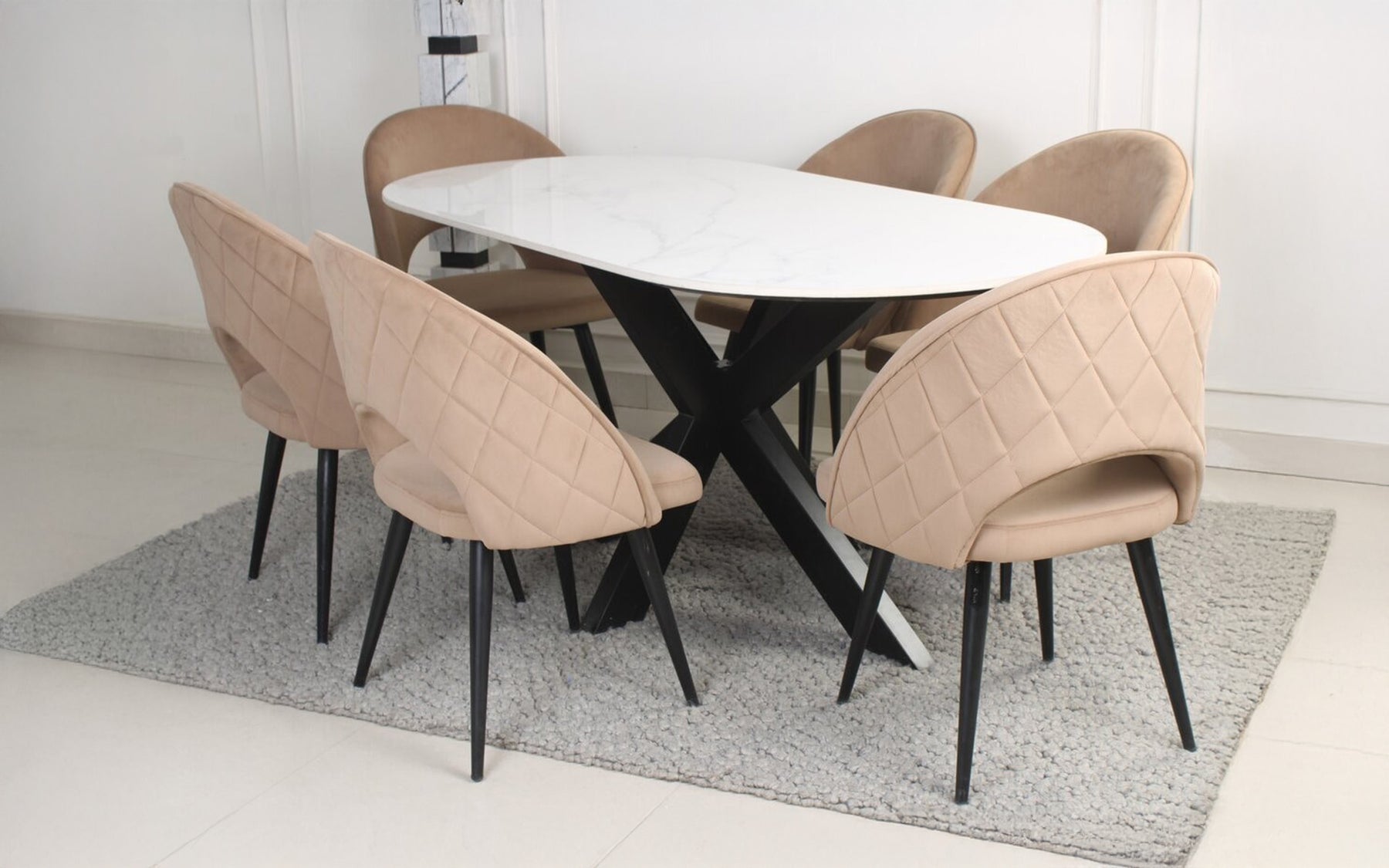The Solano 6 Seater Dining Table Set brings elegance and durability to your dining space. Featuring a stunning composite marble tabletop with a glossy finish. The sturdy CRC mild steel frame is powder-coated for complete rust and corrosion protection. Six comfortable brown velvet chairs complete the ensemble.
